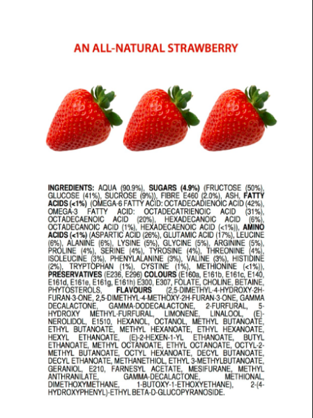 Egy ausztrál kémiatanár, James Kennedy annak szemléltetésére, hogy alkalomadtán mennyire nem bízunk az ismeretlen összetevőkben (ami normális) és mennyire előítéletesek vagyunk olyasmikkel is, amik egyébként előfordulnak a természetben is, a gyerkőcök és a laikusok okítására gyümölcsök ma ismert összetevőit tüntette fel úgy, mintha élelmiszeripari készítmények lennének. Szerintem nagyon ötletesen.